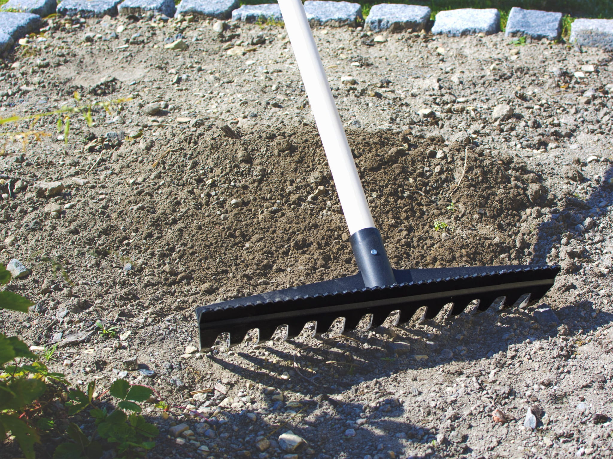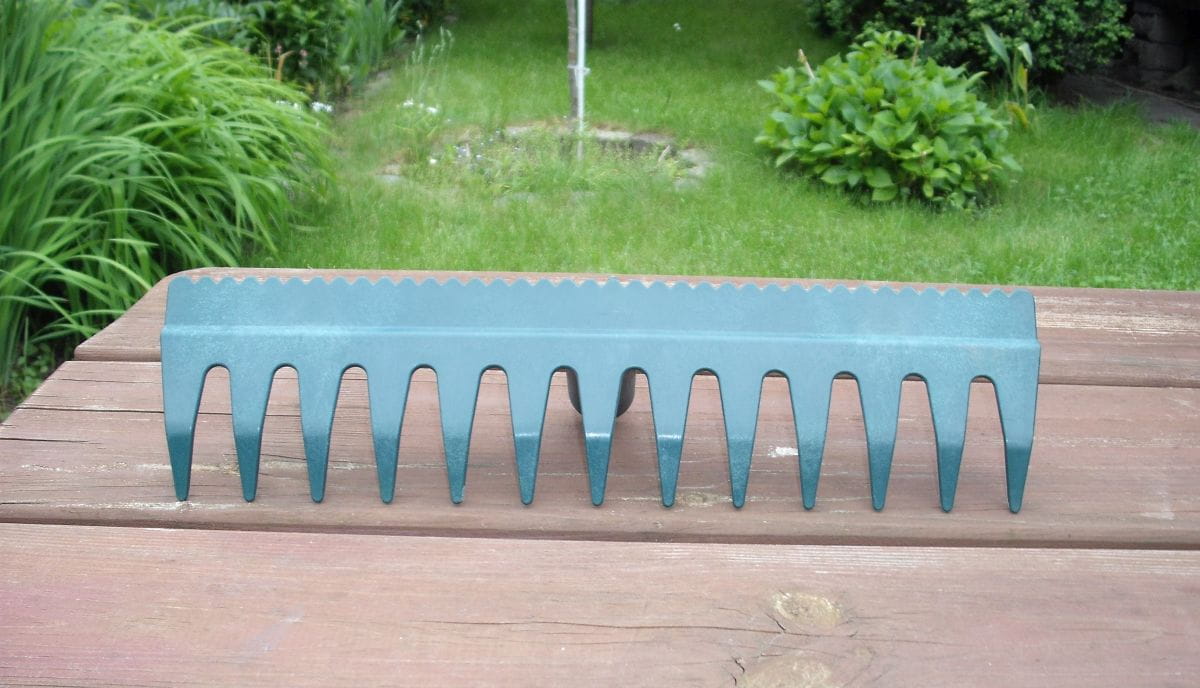 Górna ząbkowana część służy do wyrównywania zagrabionej powierzchni.
