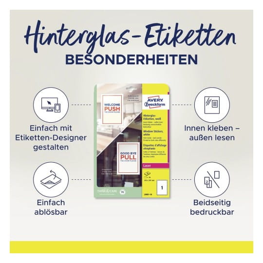 Profesjonalnie i wydajnie: podkładki pod etykiety są idealną bazą dla często zmienianych etykiet i naklejek, np. w magazynach, w których następuje dynamiczna zmiana zatowarowania. Wybierz odpowiednie miejsce – półkę, skrzynię transportową, lub inne – naklej podkładkę pod etykiety i dowolnie naklejaj i odklejaj swoje naklejki z konkretnymi komunikatami, znakami oraz informacjami. Dzięki podkładkom Avery Zweckform możesz łatwo naklejać, odklejać i przeklejać etykiety oraz naklejki bez pozostawiania nieestetycznych resztek kleju oraz papieru po etykiecie. W ten sposób można wielokrotnie zmieniać oznakowania - w szybki, tani oraz czysty sposób, bez konieczności poświęcania mnóstwa pieniędzy, czasu i energii na czyszczenie powierzchni z resztek kleju oraz naklejek. Podkładki pod etykiety są wodoodporne, odporne na warunki atmosferyczne oraz czyszczenie i wycieranie.
