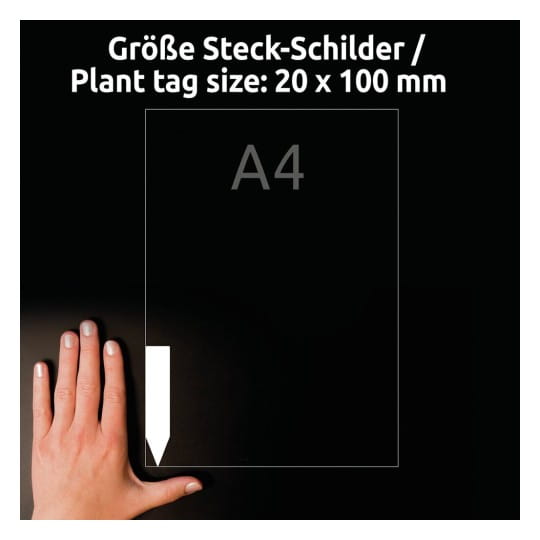 Wyjątkowo wytrzymałe tabliczki foliowe do umieszczania w miękkim podłożu są wodoodporne, odporne na rozdarcia, chemikalia oraz promieniowanie UV. Idealne również do użytku zewnętrznego. Solidna jakość folii zapobiega przypadkowemu rozdarciu tabliczek. Tabliczki foliowe do oznaczania roślin można dwustronnie zadrukować, dzięki czemu idealnie nadają się do zamieszczania dodatkowych informacji na odwrocie. Łatwe i wygodne w użyciu: po wydrukowaniu arkuszy A4 pojedyncze tabliczki można łatwo oddzielić od arkusza. Tabliczki są odpowiednie do zadruku we wszystkich standardowych drukarkach laserowych, a powierzchnia foliowego materiału zapewnia najwyższą jakość druku.
