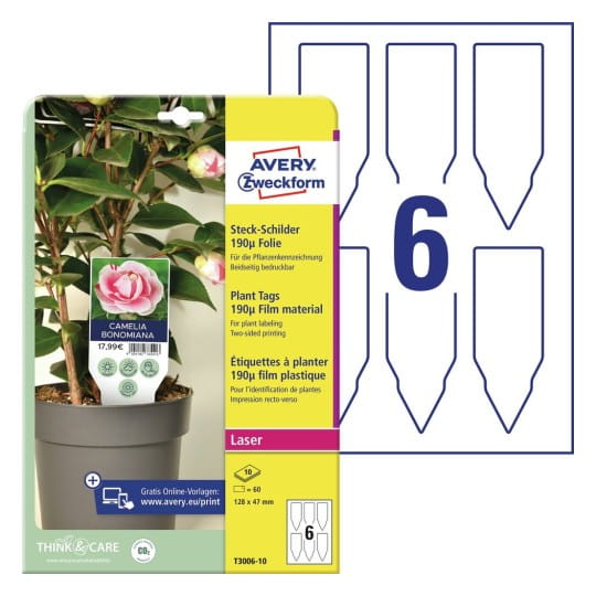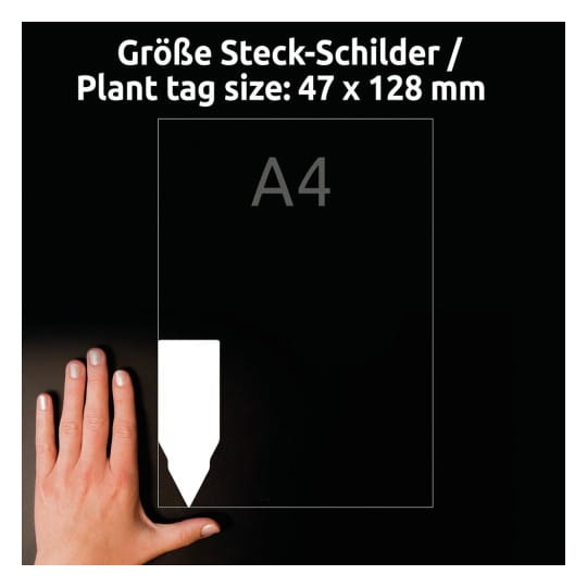 Wyjątkowo wytrzymałe tabliczki foliowe do umieszczania w miękkim podłożu są wodoodporne, odporne na rozdarcia, chemikalia oraz promieniowanie UV. Idealne również do użytku zewnętrznego. Solidna jakość folii zapobiega przypadkowemu rozdarciu tabliczek. Tabliczki foliowe do oznaczania roślin można dwustronnie zadrukować, dzięki czemu idealnie nadają się do zamieszczania dodatkowych informacji na odwrocie. Łatwe i wygodne w użyciu: po wydrukowaniu arkuszy A4 pojedyncze tabliczki można łatwo oddzielić od arkusza. Tabliczki są odpowiednie do zadruku we wszystkich standardowych drukarkach laserowych, a powierzchnia foliowego materiału zapewnia najwyższą jakość druku.