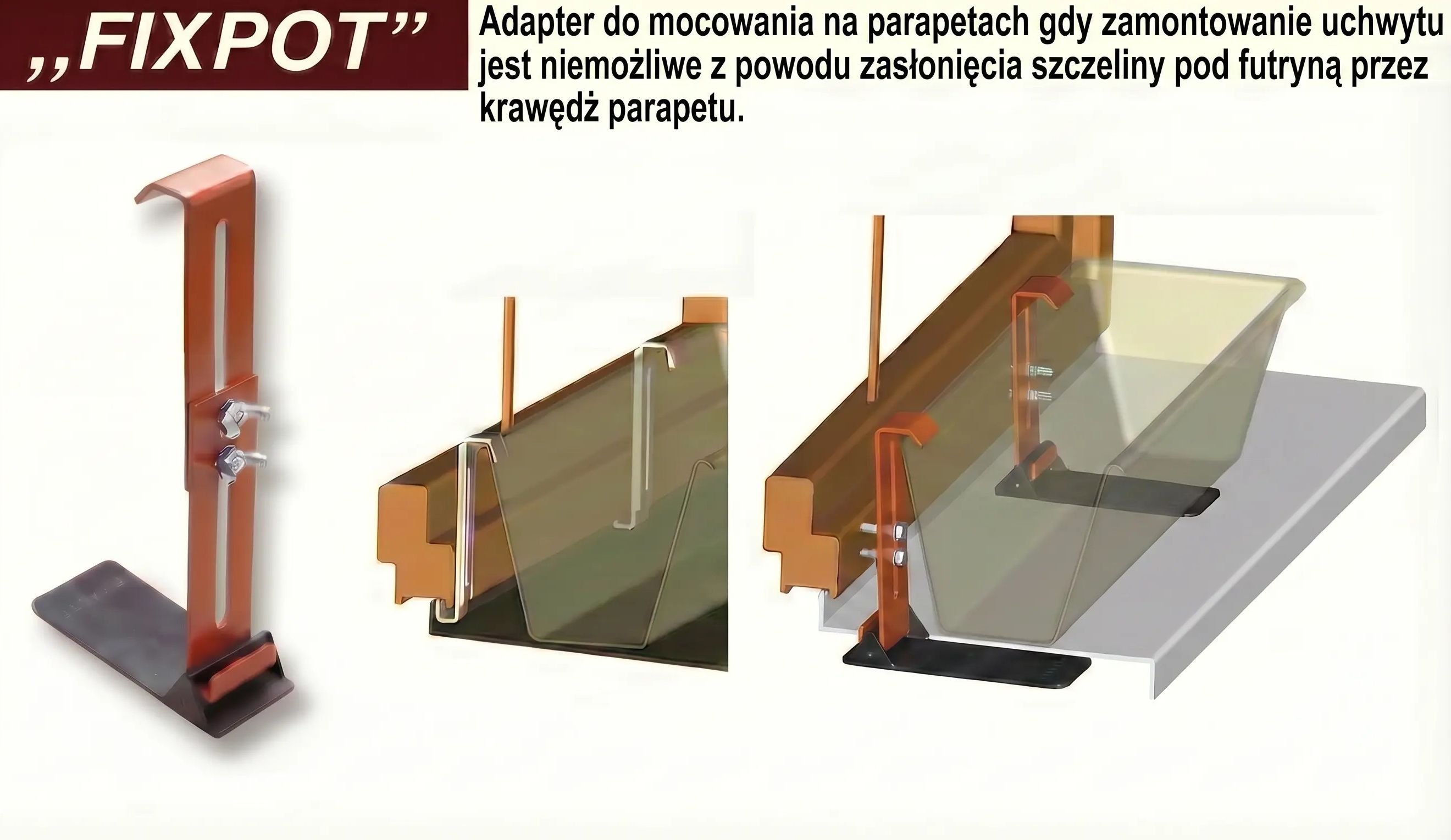 Gdy zamontowanie uchwytu jest niemożliwe z powodu zasłonięcia szczeliny pod futryną przez krawędź parapetu (zdarza się to bardzo rzadko) należy zastosować adapter do uchwytu FIXPOT.