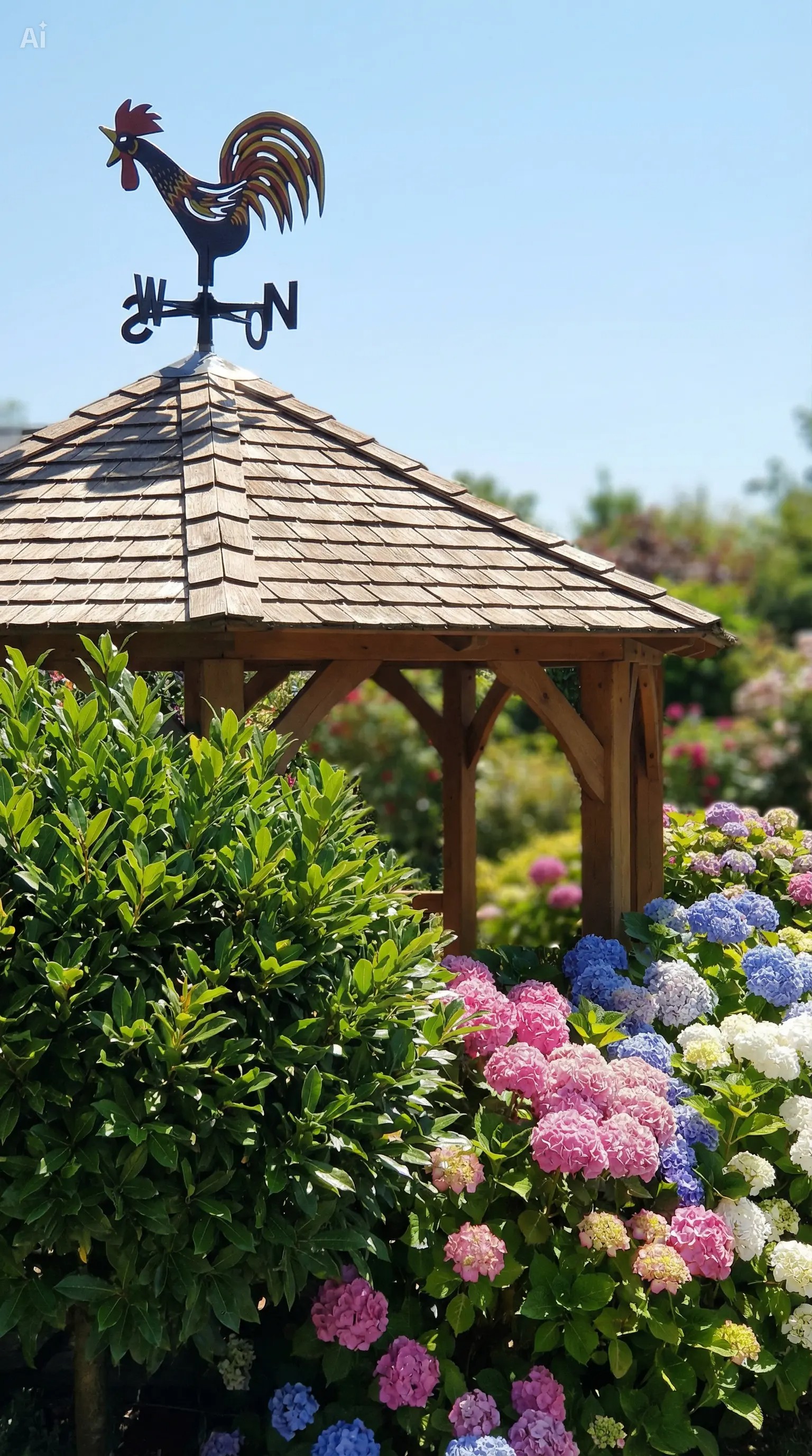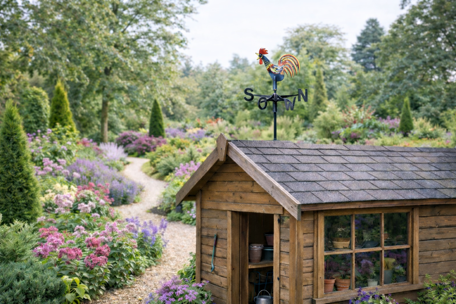 Wiatrowskaz w kształcie barwnego koguta to piękna i popularna ozdoba ogrodu - urządzenie wskazujące kierunek wiatru. Oznaczenie stron świata jest w języku niemieckim (S, O, W, N)