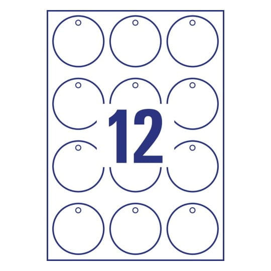 Białe, dwustronne zawieszki foliowe Avery Zweckform T3004-10 do zadruku, okrągłe o średnicy 60 mm.