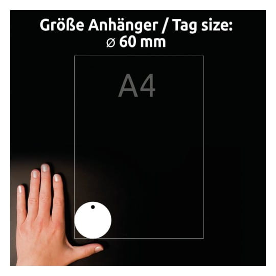 Bardzo wysokiej jakości zawieszki wykonane z mocnej, białej folii są: wodoodporne, odporne na rozdarcia, chemikalia oraz promieniowanie UV. Idealne również do użytku zewnętrznego. Solidna jakość folii zapobiega przypadkowemu rozdarciu zawieszek. Zawieszki foliowe można dwustronnie zadrukować, dzięki czemu idealnie nadają się do zamieszczania dodatkowych informacji na odwrocie zawieszki. Łatwe i wygodne w użyciu: po wydrukowaniu arkuszy A4 pojedyncze zawieszki można łatwo oddzielić od arkusza. Zawieszki są odpowiednie do zadruku we wszystkich standardowych drukarkach laserowych, a powierzchnia foliowego materiału zapewnia najwyższą jakość druku. W zestawie znajdują się również sznurki mocujące.